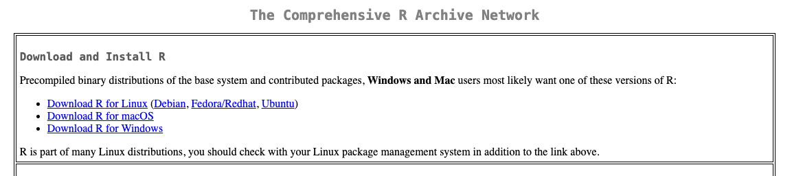 Go to the CRAN (The Comprehensive R Archive Network) website: https://cran.r-project.org/