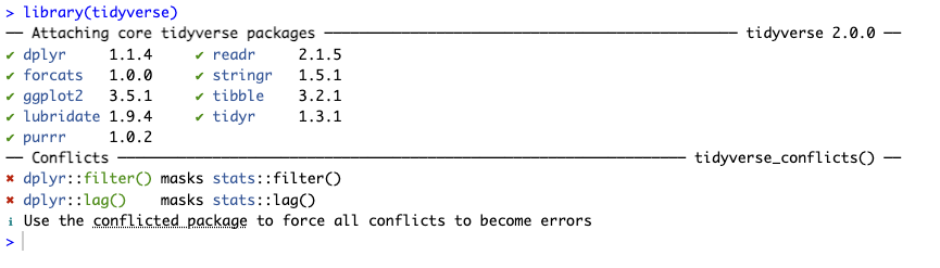 You should see output similar to this if tidyverse was installed correctly, although the version numbers may differ: