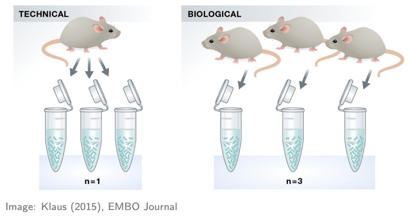 - If you don’t have replicates (ideally for all groups), STOP! You’ll likely produce rubbish results (actually statistical tools will often give you an error in this situation, but not always!). Here “replicates” means biological replicates (data collected from distinct individuals), not technical replicates (data repeatedly collected from the same individual), a distinction nicely depicted in the figure below. Biological replicates are essential because you cannot do rigorous RNA-seq analysis (i.e. statistics) without them. Why? There are many reasons, e.g. you’ll have no way of estimating the (biological) variation, i.e. “noise”, in your data and so no way of properly comparing any “signal” (of DE) to the “noise” (actually there are some ways around this issue but they’re not recommended). Thus, 2 replicates is a minimum and 3+ replicates (depending on the context and situation) are recommended.