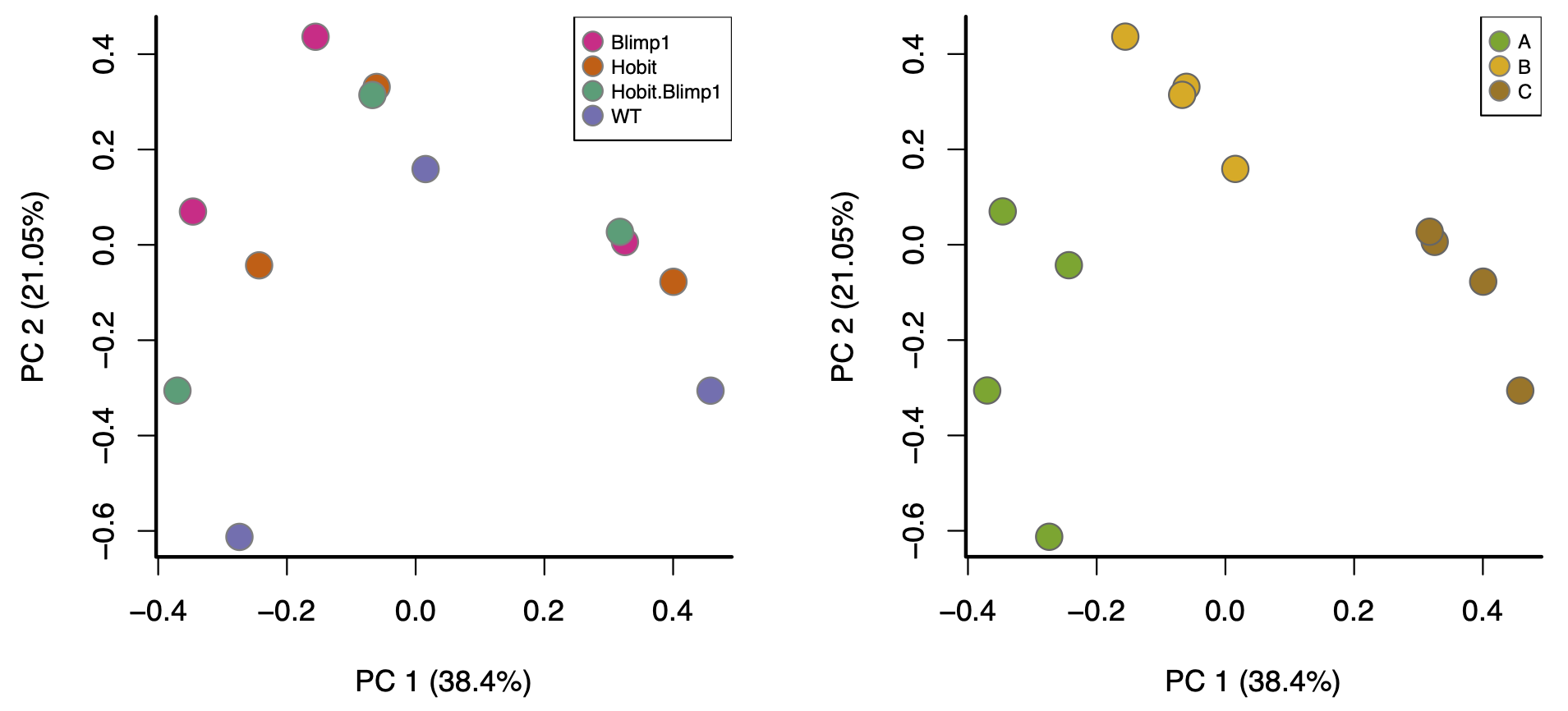 These differences can lead to so-called “batch effects”. For example, consider these PCA plots of a real data set: