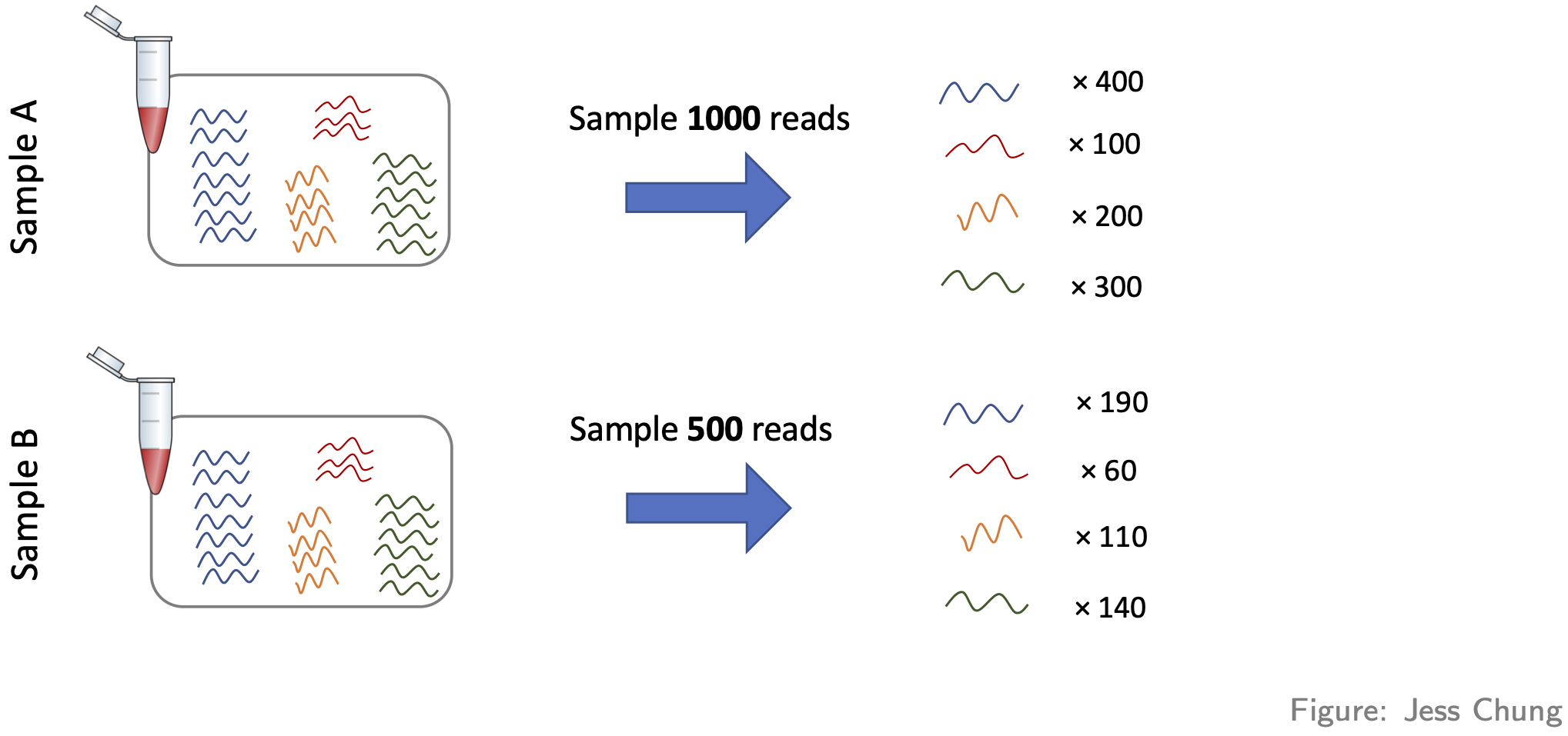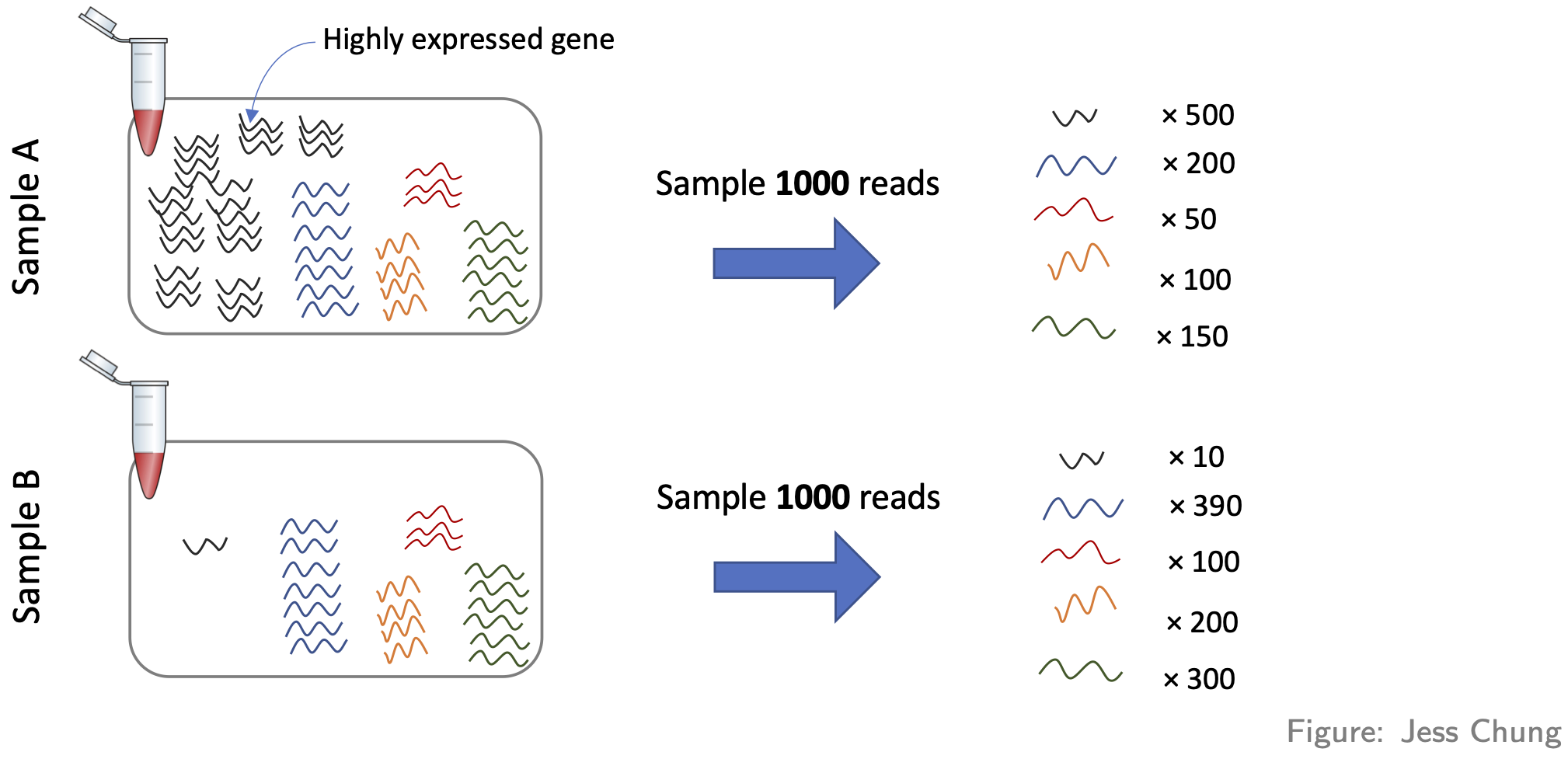 - Compositional differences. For each sample, the probability of sequencing a transcript is proportional to its abundance—this is the basis of how RNA-seq works (of course!). To see the potential problem this fact creates, look at this figure: