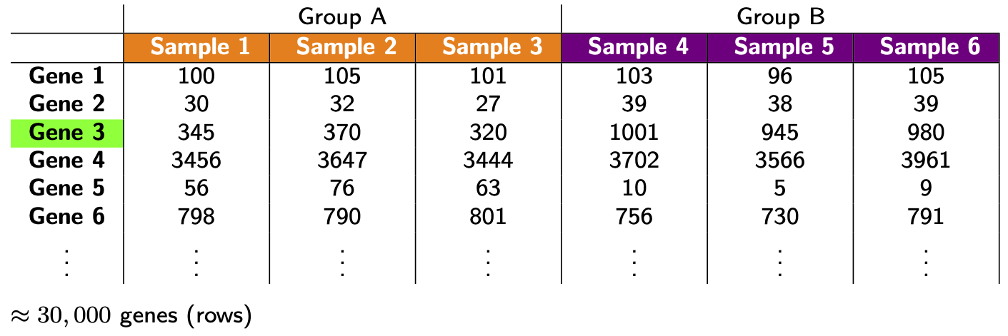 Does Gene 3 show a biological or technical difference between the two groups? Looks like a biological difference, but what if I told you the library sizes for group B were 3 times bigger? In that case, the difference looks more like an artifact of library size rather than a true biological difference. Let’s look at the problem another way: