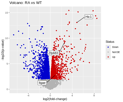 labs(title="Volcano: RA vs WT", x="log2(fold-change)", y="-log10(p-value)")