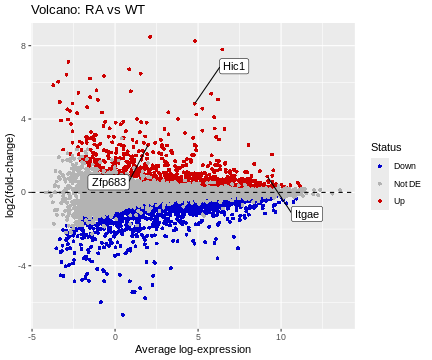 labs(title="Volcano: RA vs WT", x="Average log-expression", y="log2(fold-change)")