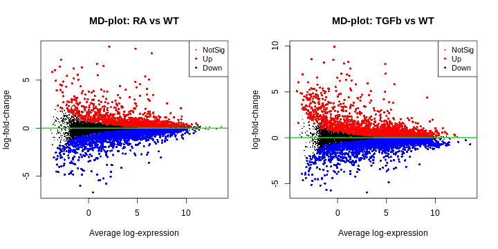 plotMD(fit2, coef="RA_WT", status=dt[,"RA_WT"], cex=0.6, main="MD-plot: RA vs WT") # MD plot