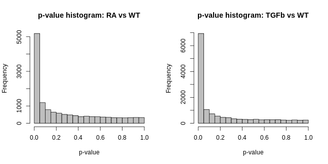 hist(fit2$p.value[,"RA_WT"], col="grey", xlab="p-value", main="p-value histogram: RA vs WT") # p-value hist