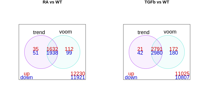 To reinforce what you’ve learnt, try your hand at finding DE results for the RA+TGFb vs WT comparison using both limma approaches.