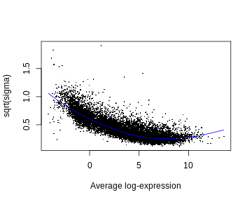 v <- voom(dge, design=X, plot=TRUE) # same X as above
